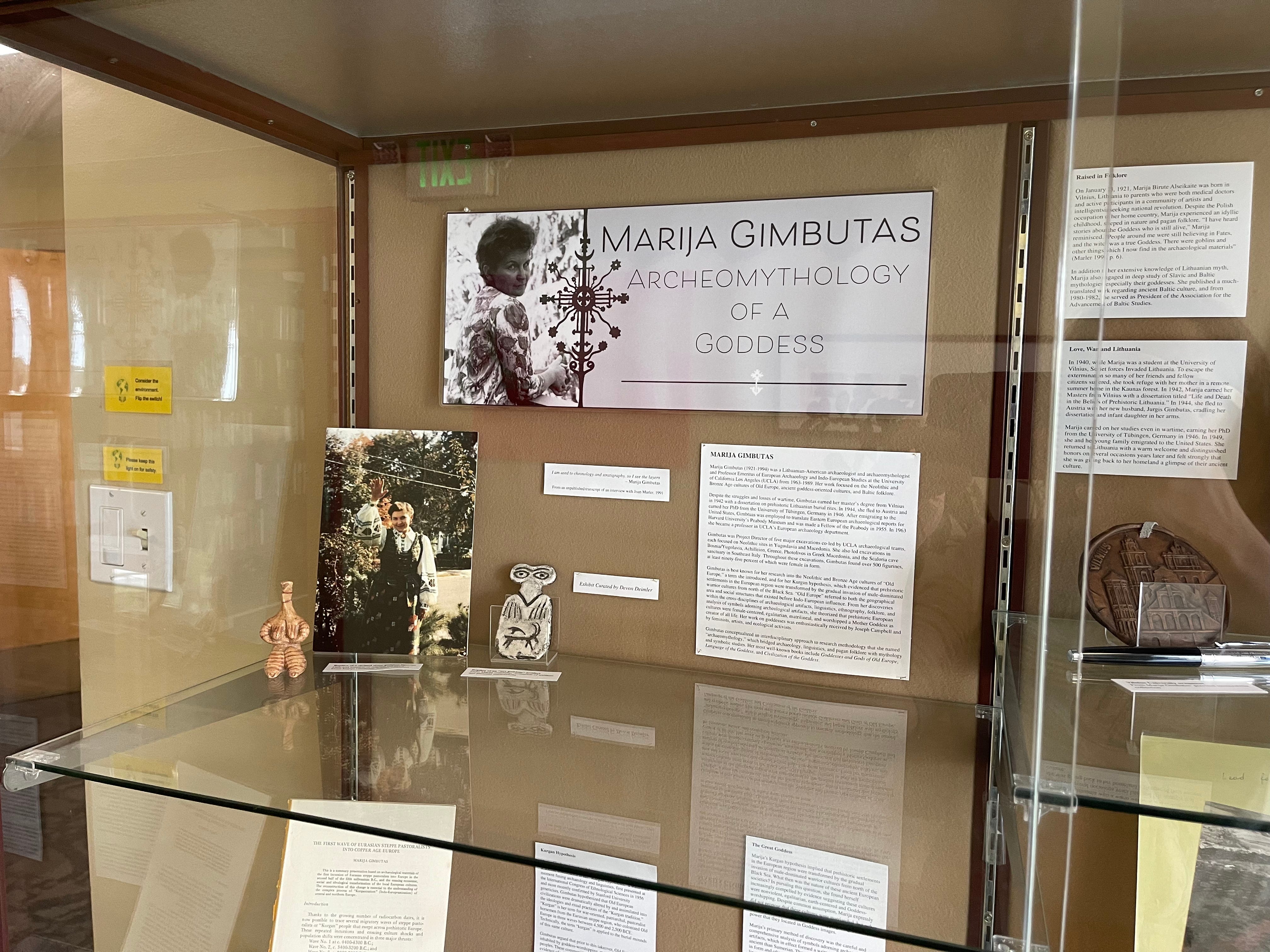 OPUS Archives Curator Dr. Devon Deimler installed the exhibit, Marija Gimbutas Archeomythology of a Goddess in the display case next to the Woodman Library in the Administration building at the Ladera Lane campus of Pacifica Graduate Institute.